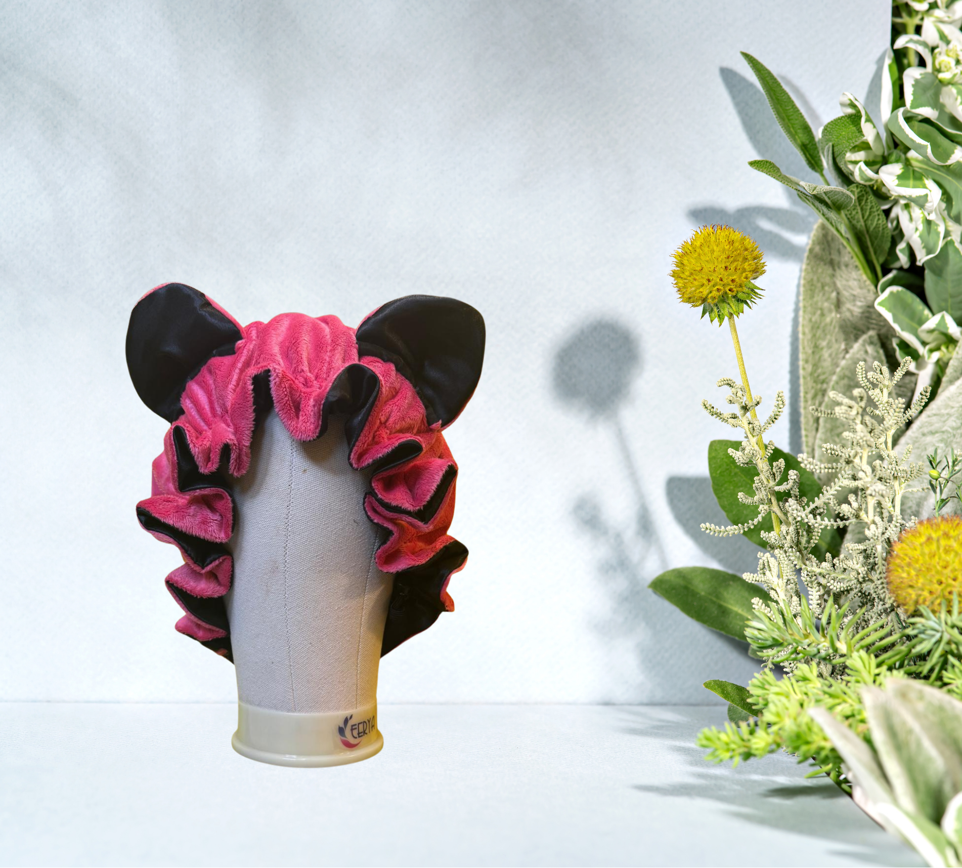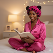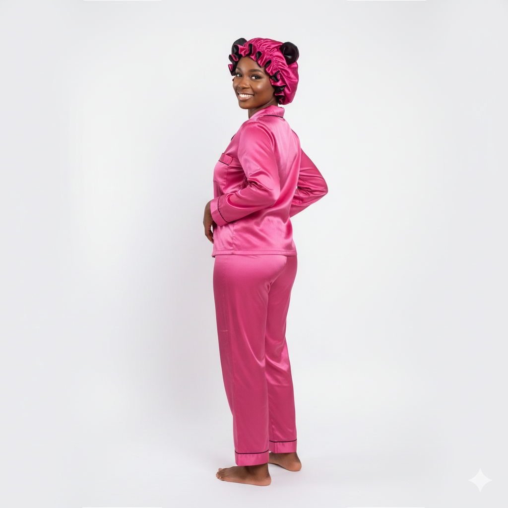 This elegant black and pink bonnet features a luxurious fur exterior that provides warmth and a sophisticated look, while the smooth satin lining ensures comfort and protects your hair. Expertly crafted, it combines style and functionality, making it an ideal accessory for both cozy indoor wear and fashionable outdoor use.